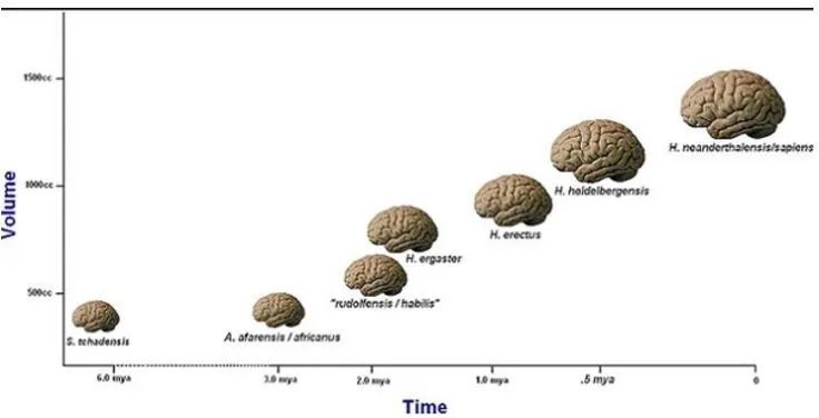 脑容量比例,在600万-300万年之间,基本上是没发生变化的,然而200万年前,这个数字开始持续增加,也就代表,主动性的选择开始持续加强,即人类对智力的追求至少有200万年的历史了