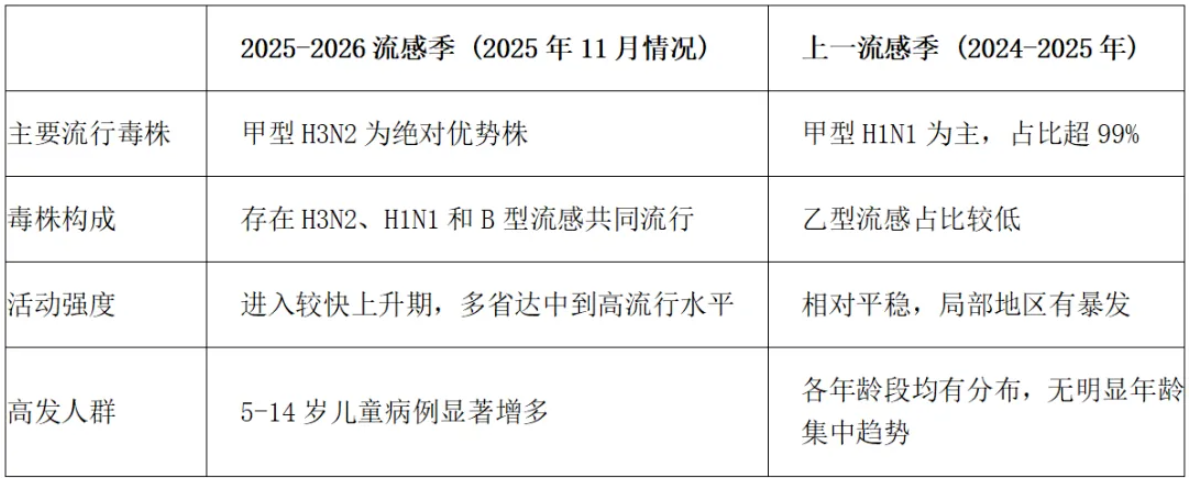 今年流感的核心变化是流行毒株变了!上一季主导的甲型H1N1退居次位,甲型H3N2成为本季主流毒株。由于H3N2近两年没有大规模流行,人群普遍缺乏针对性免疫屏障,感染风险明显上升。
