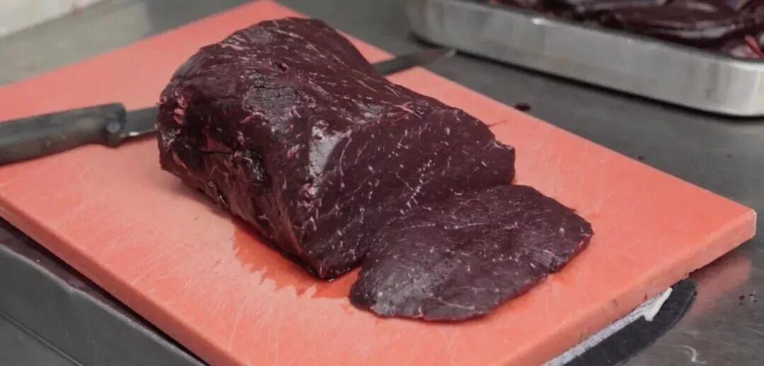 🔺鲸鱼肉。肌红蛋白能使肌肉呈现红色,于是肌红蛋浓度极高的鲸类,其肌肉颜色几乎是红得发黑。(图片来源:[1])